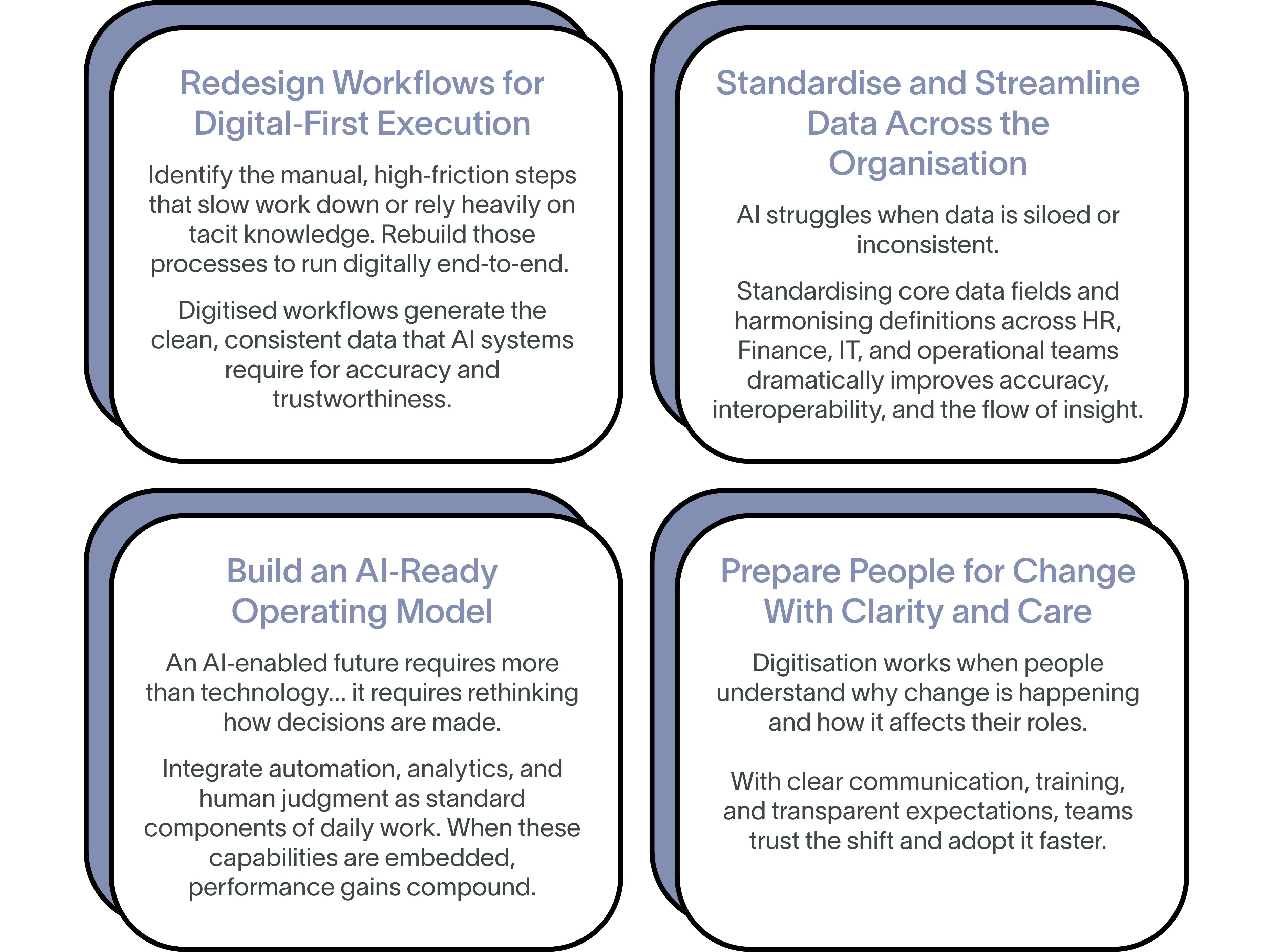 Organisations that embrace digitisation now - re‑engineering workflows and rethinking roles - will be the ones who use AI to elevate people, not replace them. They will unlock higher innovation, stronger capability, and more meaningful work.
